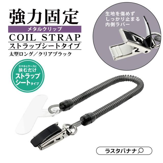 【送料無料】スマートフォン 落下防止 紛失防止 ストラップ コイルストラップ メタルクリップ ストラップシートタイプ 強力固定 ロングタイプ ブラック RCSTMHL01BK ラスタバナナ