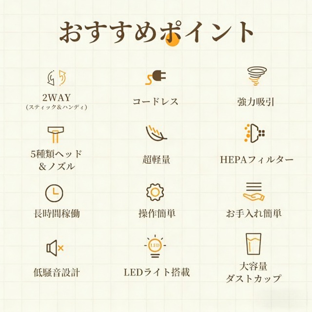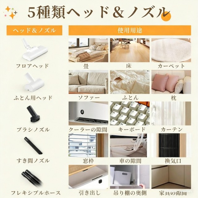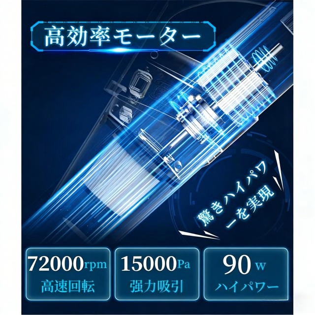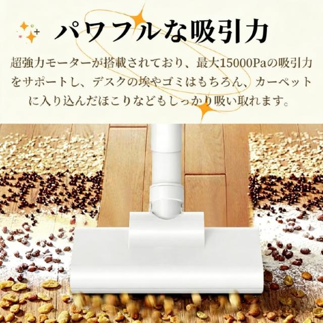 最大 15000Pa 強力吸引 & 90W 駆動力で、ホコリ・髪の毛・ペット砂や残りカスまでスムーズ除去!5 種類の専用ノズルを装備し、床・ソファ・細かい隙間まで掃除の死角ゼロ。ワイヤレス 2WAY 仕様で室内のあらゆるコーナーに対応、延長管を使い分けて棒式・ポータブル両用に切り替え可能。車載対応に加え LED ライトを搭載、暗い隙間の汚れも見やすく掃除でき、室内外どこでも便利に使える多機能掃除機。