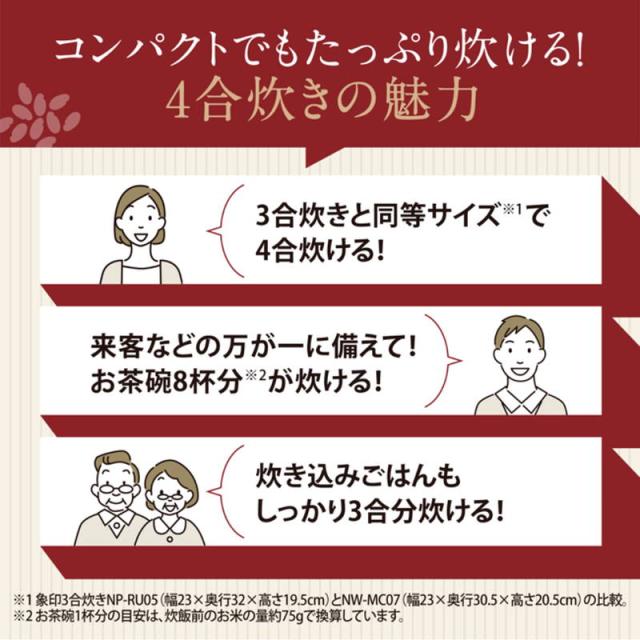 3合炊きのサイズ感はそのままに容量をアップ。置き場所に困らず、余裕を持って炊ける4合タイプです。