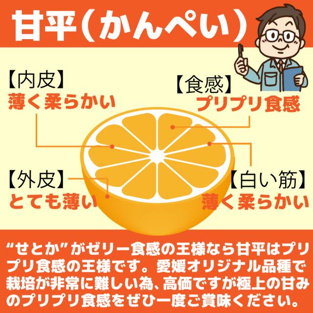 (甘平について) せとかやデコポンに似た濃厚な味わいと、プリプリとした食感が堪らない、贈答用であれば1玉数百円〜数千円なる高級柑橘です。今回は傷アリ、大きさ不揃いにつき特価を実現しております。
