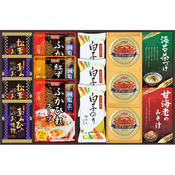 ふかひれスープ:160g×2、紅ずわいがにスープ:160g×1、紅ずわいがにほぐし身:55g×3、あわび入お吸い物×2、松茸入りお吸い物×2、甘海老みそ汁:2袋×1、丸美屋のり茶漬け:4袋×1、白子のり:8切5枚×3