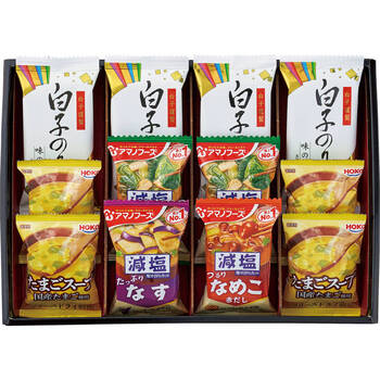 アマノフーズの減塩おみそ汁とたまごスープに白子のり味のりを詰め合わせました。
