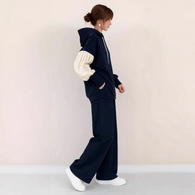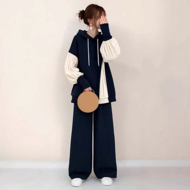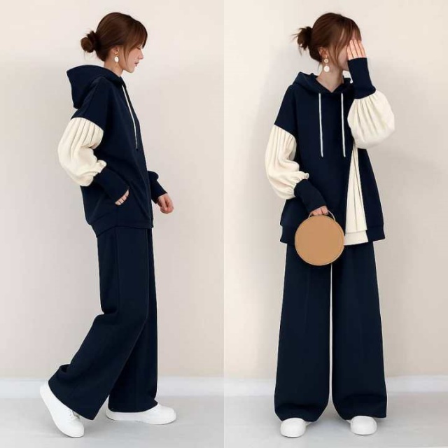 セットアップ 2点セット レディース トップス パーカー フード付き 長袖 パフスリーブ ボトムズ ワイドパンツ ゆったり 無地 大人おしゃれ カジュアルセット 送料無料