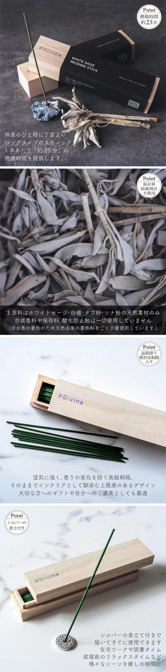 アロマ お香 Divina ディヴィーナ ホワイトセージ スティック香 桐箱仕様 40本入り お香立付き 100%天然原料 サンダルウッド 白檀 ブレンド ロングタイプ インセンス フレグランス ヒーリング 浄化 リラックス ルームフレグランス おしゃれ ギフト インテリア