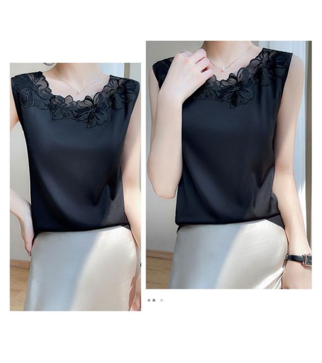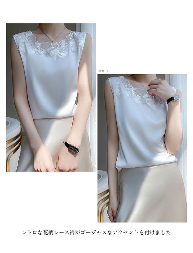 ブラウス ノースリーブ サテン レディース タンクトップ レースブラウス 袖なし 夏 サテンブラウス 滑らか 光沢 軽薄 トップス レース襟 花柄レース セレモニー サテンタンクトップ 涼しい レトロ