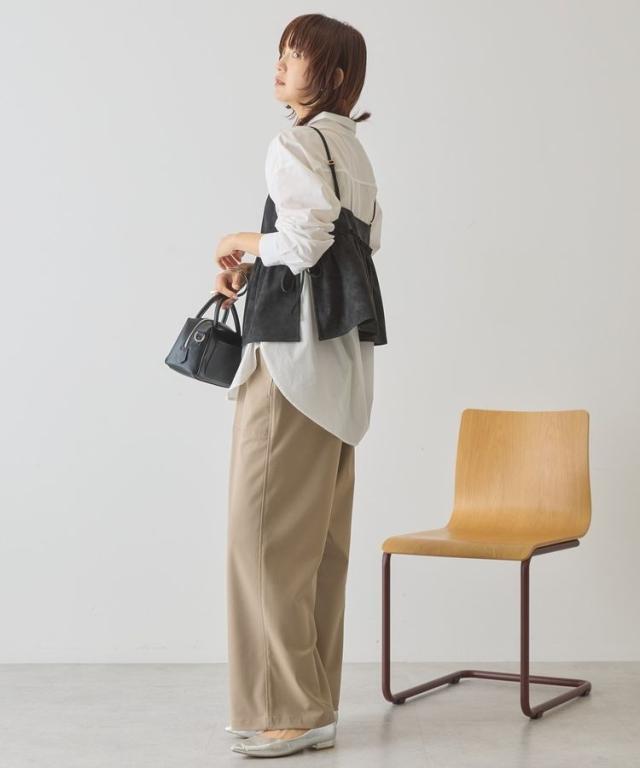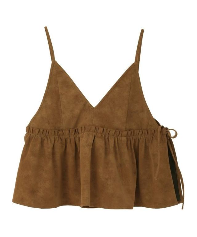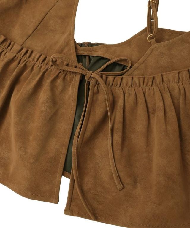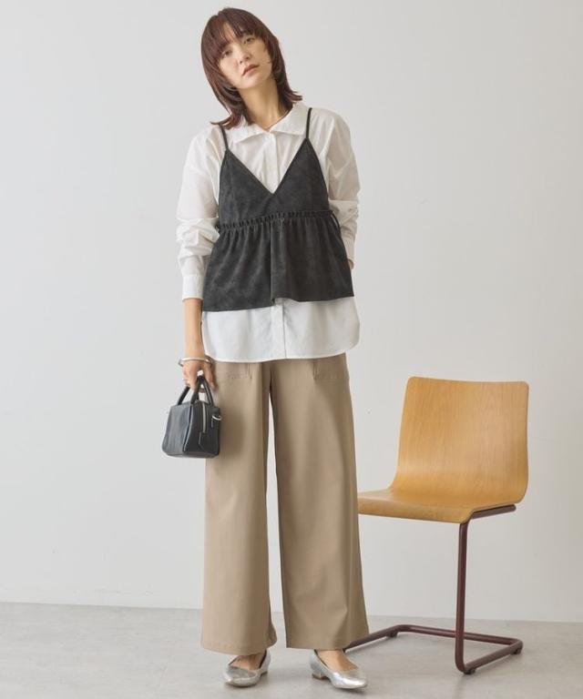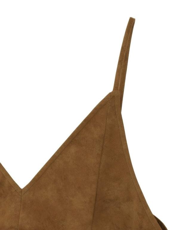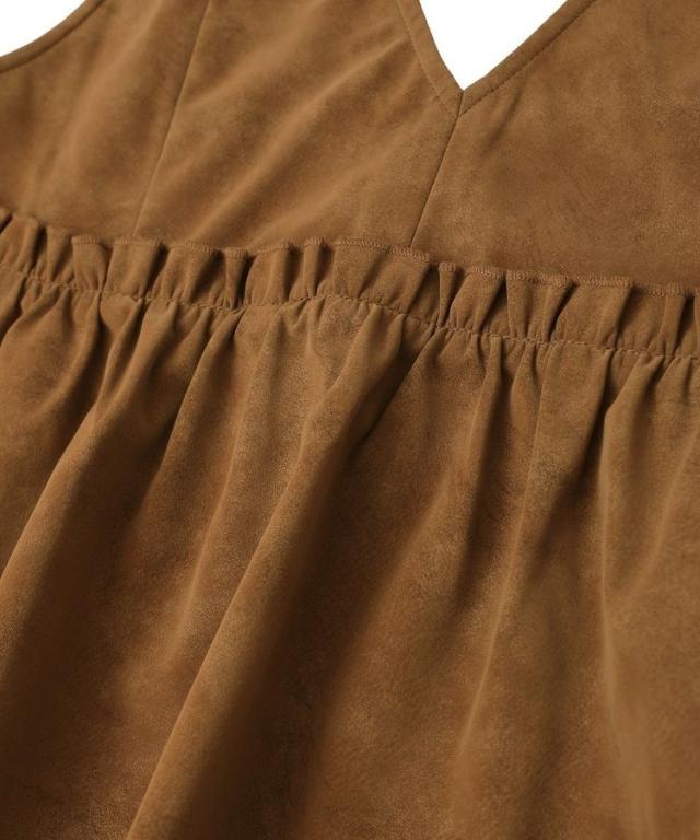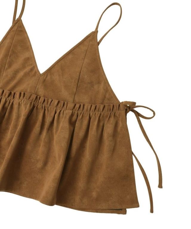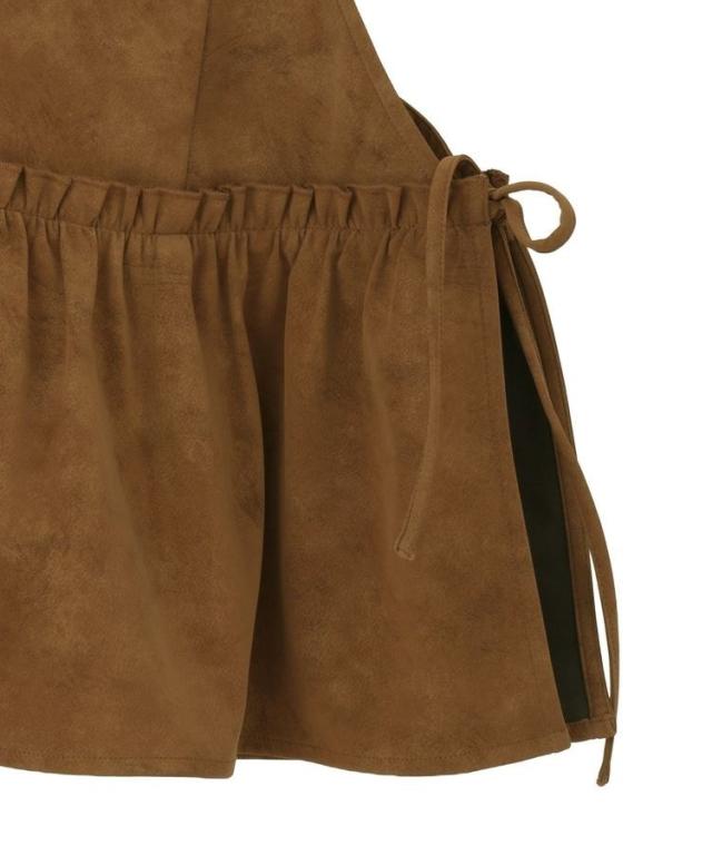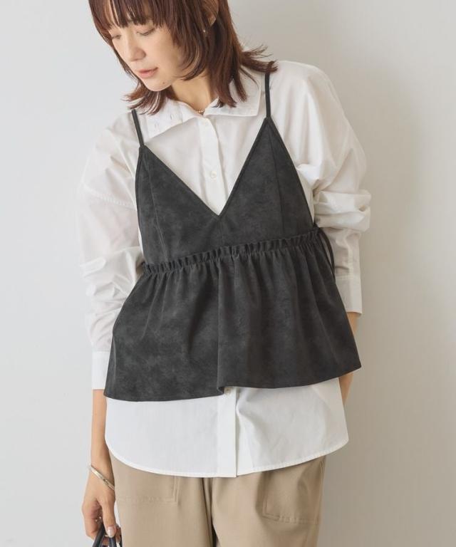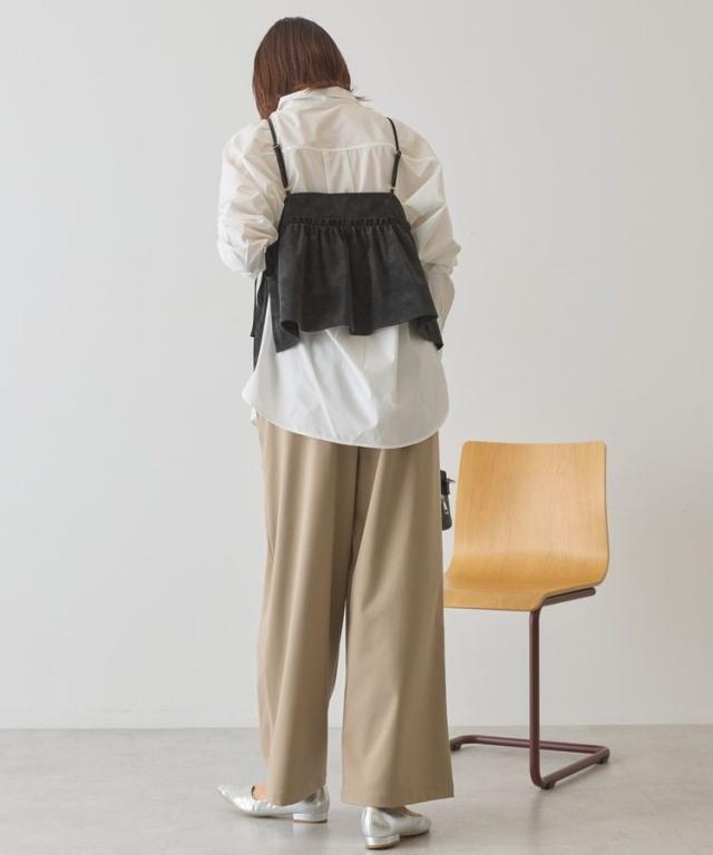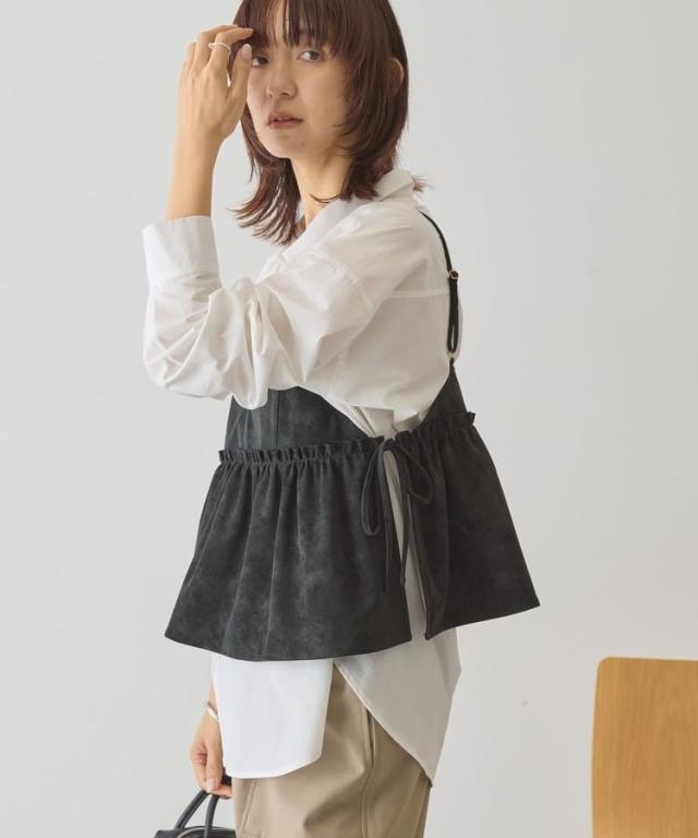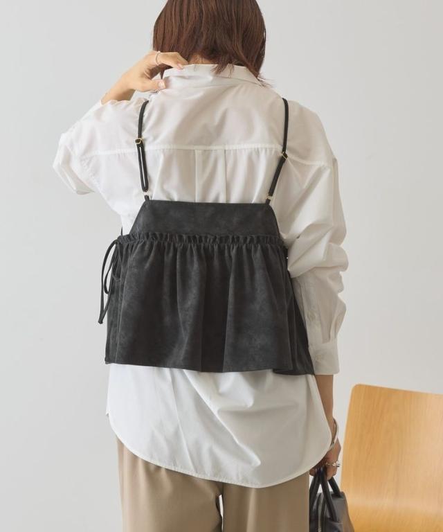 いつものスタイルに重ねて一気にこなれるレザーライクビスチェ。ロングTシャツやインナーにプラスするだけでボヘミアンカジュアルスタイルが完成します。華奢なストラップやギャザーフレアディテールが女性らしい印象をプラス。1枚持っておくとおしゃれの幅がグッと広がるおすすめのアイテムです。透け感[なし]