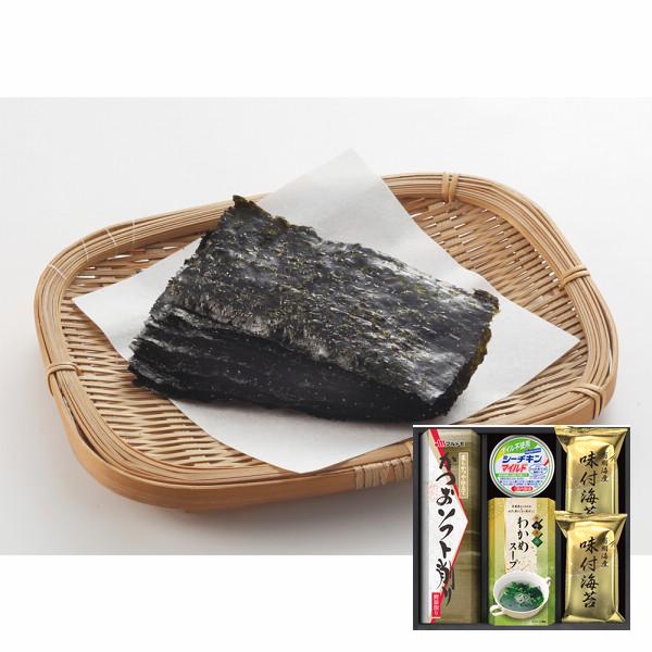 ●有明海産味付海苔(8切4枚)×2、マルトモかつおソフト削り(2g×3)・はごろもフーズオイル不使用シーチキンマイルド70g・わかめスープ(5.3g×2・粉末)×各1