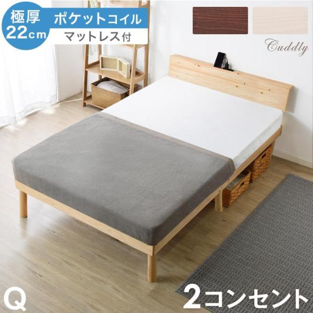 【本日P5%還元】 ベッド マットレス付き クイーン 北欧パイン 天然木 ポケットコイル マットレス付 22cm 宮棚 2口コンセント ベッドフレーム フレーム すのこベッド すのこ マットレスセット ベッドセット 棚 北欧