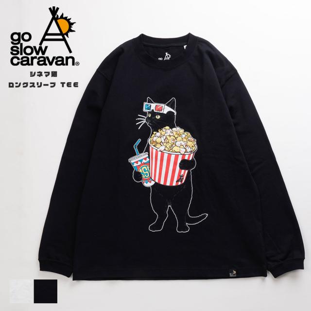 猫Tシャツ 猫ロンT キャットプリント 長袖Tシャツ ロングスリーブT カットソー ユニセックスTシャツ USAコットン 綿100 ロンTEE イラストTシャツ グラフィックT アニマルT ポップデザイン 映画モチーフ シネマ猫 ポップコーン猫 レトロメガネ 黒猫プリント 白猫プリント カジュアルトップス デイリーウェア go slow caravan ゴースローキャラバン アウトドア系ブランド フェスコーデ キャンプコーデ 男女兼用Tシャツ カジュアルロンT