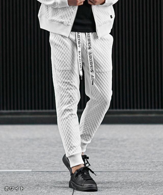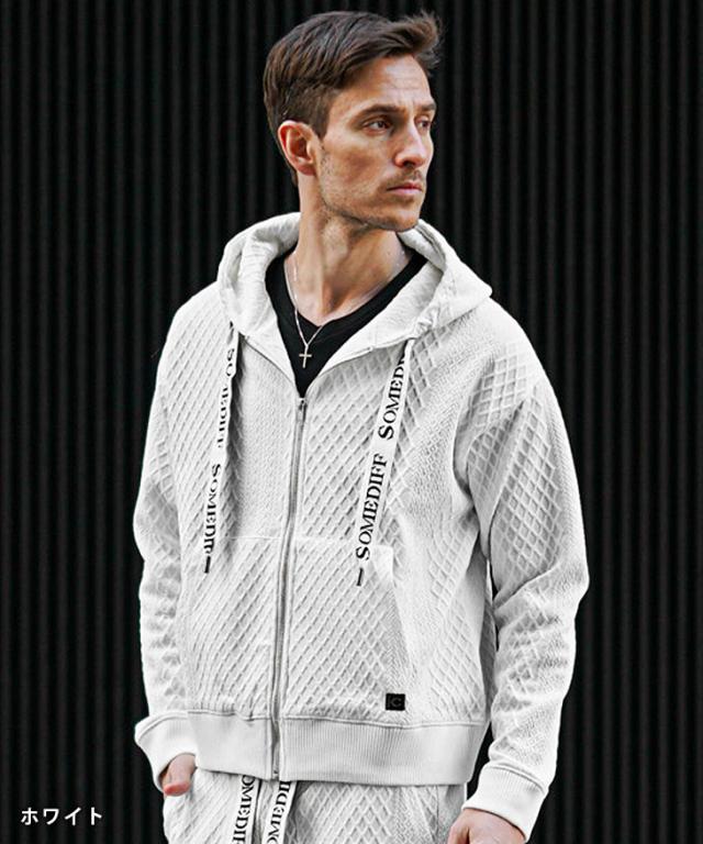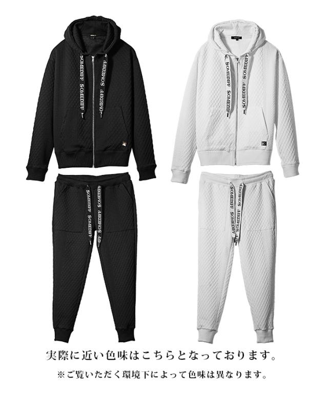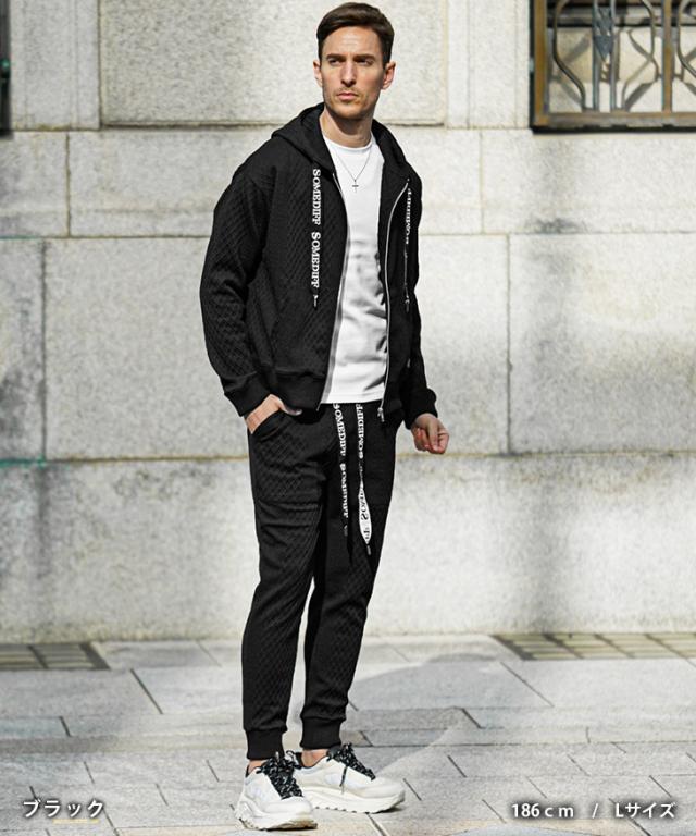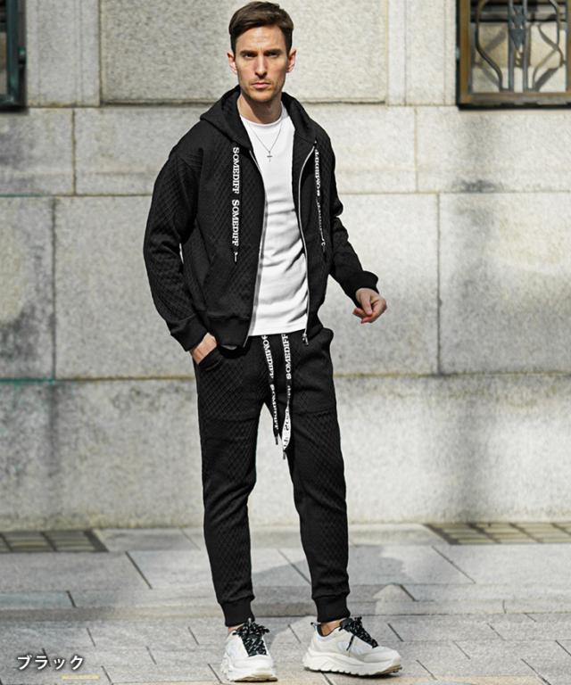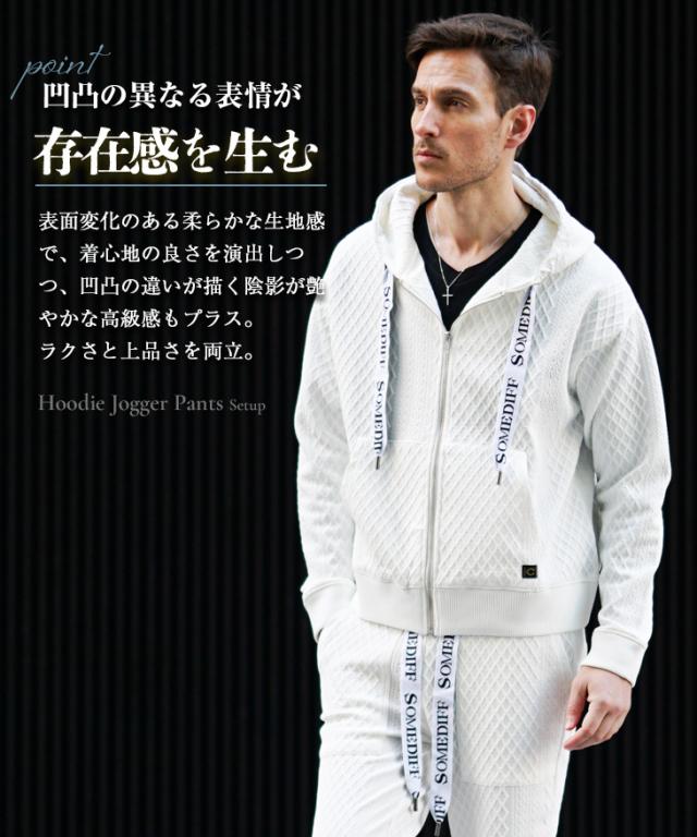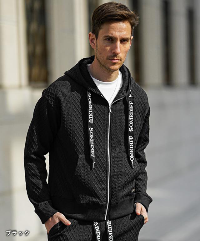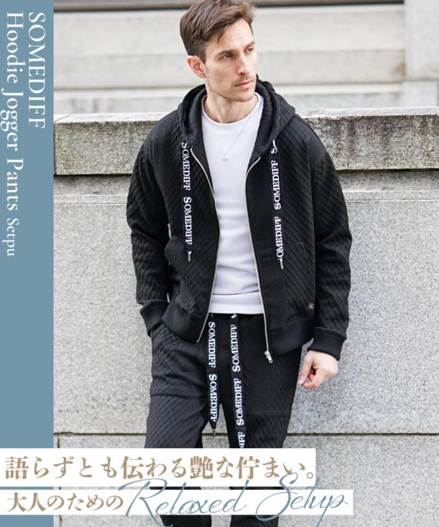 SOMEDIFF(サムディフ)『リラックスパーカー×ジョガーSETUP』【リラックスジョガーセットアップ】■Design/デザイン軽快でラグスポなムード漂うZIPパーカー×ジョガーパンツのセットアップ。快適さはもちろんのこと、異なる凹凸のパターンを生地の切り替えとして挟むことでシンプルながら目を惹くデザインに。軽量でありながらもストレッチ性に優れ、洒脱な着こなしに仕上げてくれる。パーカーやジョガーパンツの紐には、ブランドロゴがさりげなくあしらわれており、細部まで徹底したこだわりが感じられる。■Material/素材感ポリエステルとポリウレタンを混合した、なめらかな肌ざわりが特徴。伸縮素材を採用しており、窮屈感のない快適な着心地を楽しめる。