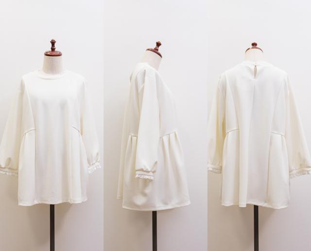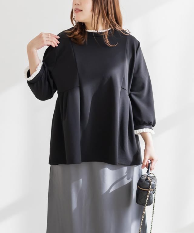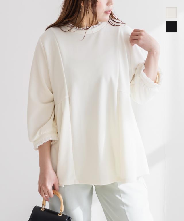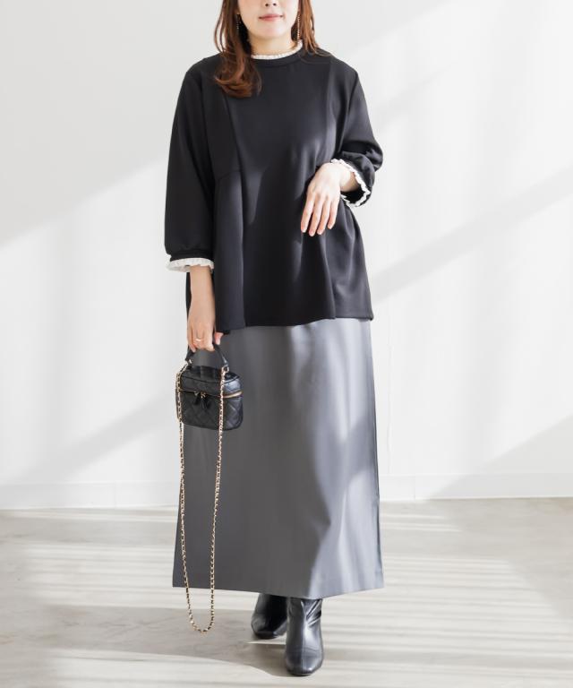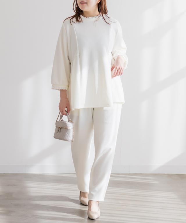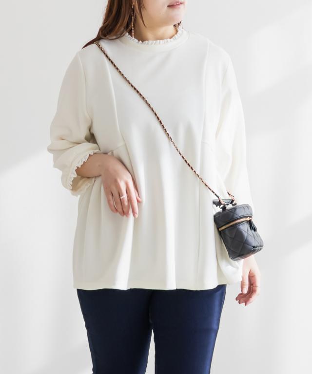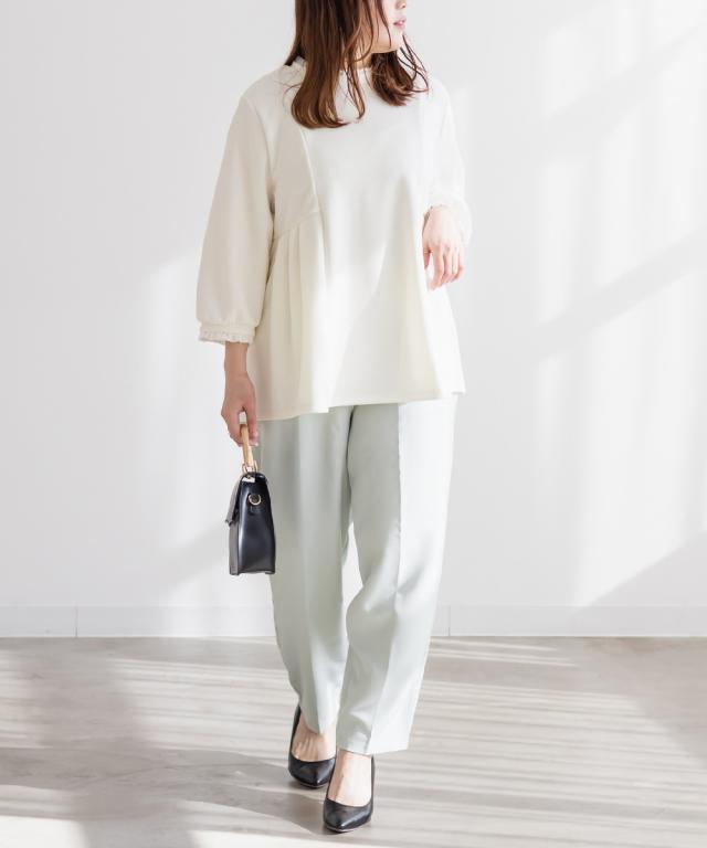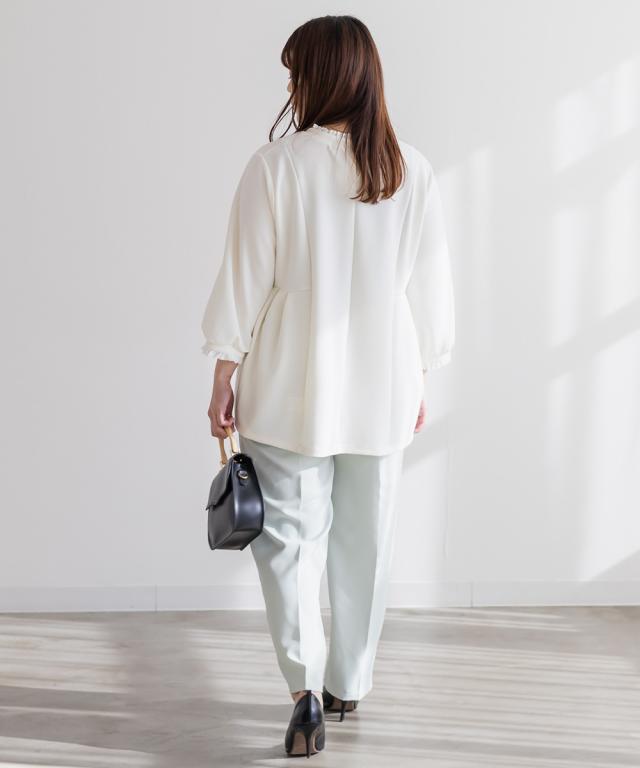 | 3Lサイズを着用しました。こちらは身幅やバストまわりにほどよくゆとりがあり、いつも着ているブラウスと比べても窮屈感なく着られました。プチハイネックですが首まわりはきつくなく、顔まわりが上品に見えるのが嬉しいです。ウエストから広がるペプラムシルエットが、お腹や腰まわりを自然にカバーしてくれて、着るだけで女性らしいバランスに◎ パンツ合わせですっきり着ても、スカートと合わせてフェミニンにまとめても可愛く、オンオフ問わず使いやすい1枚です♪ |