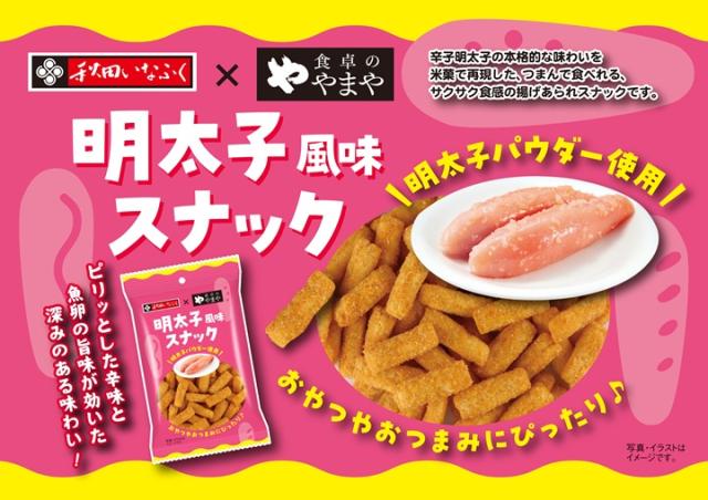 辛子明太子の本格的な味わいを米菓で再現した、つまんで食べれる、サクサク食感の揚げあられスナックです。