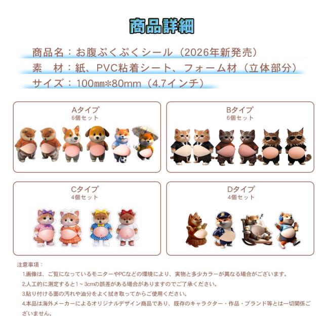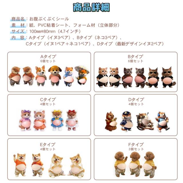 内容:Aタイプ(イヌ3ペア)、Bタイプ(ネコ3ペア)、Cタイプ(イヌ1ペア+ネコ1ペア)、Dタイプ(最新デザインイヌ2ペア)