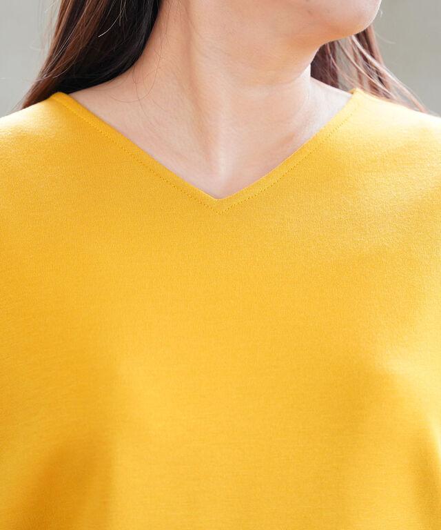 深すぎず、広すぎずのコンパクトなVネックは、