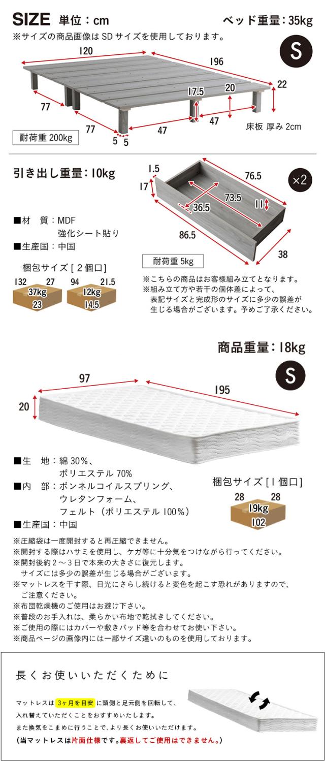 ベッド:約W120 x D196 x H22cm(35kg)