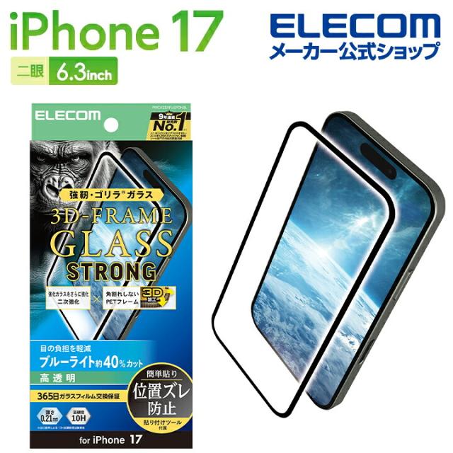 エレコム iPhone 17 用 ガラスフィルム ゴリラ 0.21mm フレーム付き 二次強化 ブルーライトカット iPhone17 ガラス 液晶 保護フィルム ┃PMCA25AFLGFOHBL