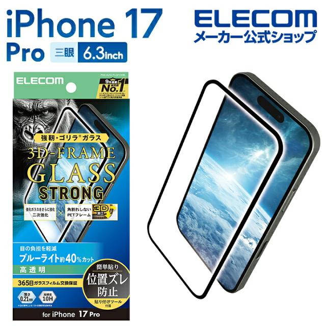 エレコム iPhone 17 Pro 用 ガラスフィルム ゴリラ 0.21mm フレーム付き 二次強化 ブルーライトカット iPhone17Pro ガラス 液晶 保護フィルム ┃PMCA25CFLGFOHBL