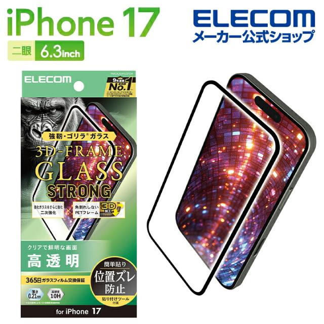 エレコム iPhone 17 用 ガラスフィルム ゴリラ 0.21mm フレーム付き 二次強化 高透明 iPhone17 ガラス 液晶 保護フィルム ┃PMCA25AFLGFOH