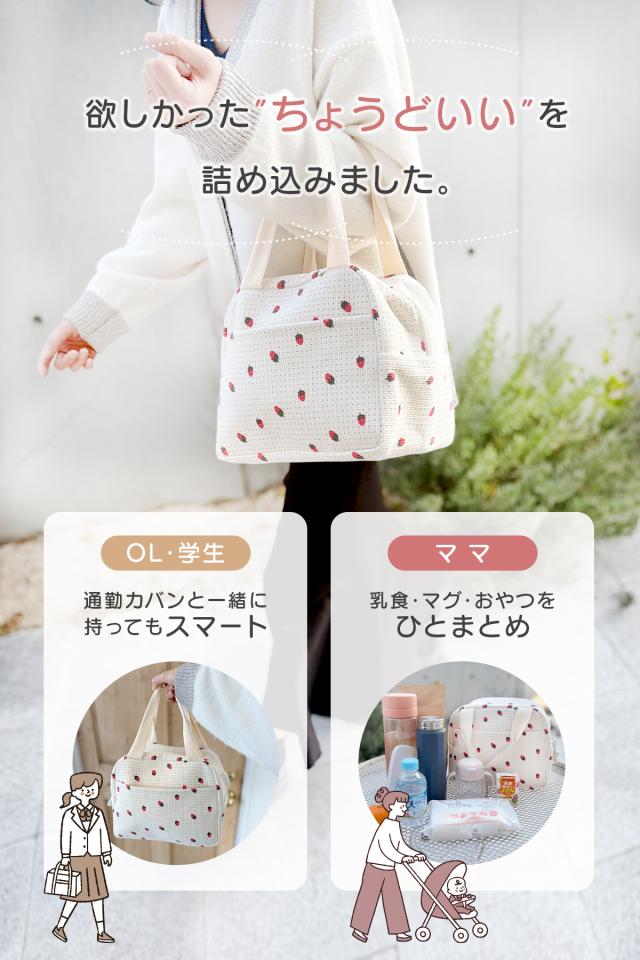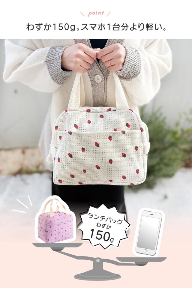 ランチバッグを探すとき、 「大きすぎる」「小さすぎる」「重い」「使いにくい」 そんな悩みを感じたことはありませんか? 本商品は、毎日のランチに本当に“ちょうどいい”サイズ感を追求した 保冷・保温対応のランチバッグです。 内側にはアルミ蒸着シートを使用し、 お弁当はもちろん、500ml〜600mlのペットボトル、 デザートや保冷剤までまとめて収納可能。 しっかり自立する設計なので、 お弁当が傾きにくく、出し入れもスムーズ。 コンビニ弁当の持ち運びにも安心です。 重量は約150gと軽量。 通勤・通学、子どものお弁当、ピクニックやレジャーまで 幅広いシーンで使いやすいランチバッグです。 |