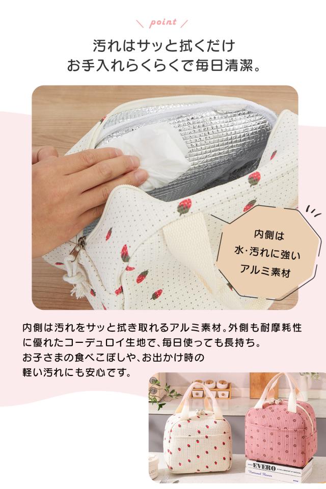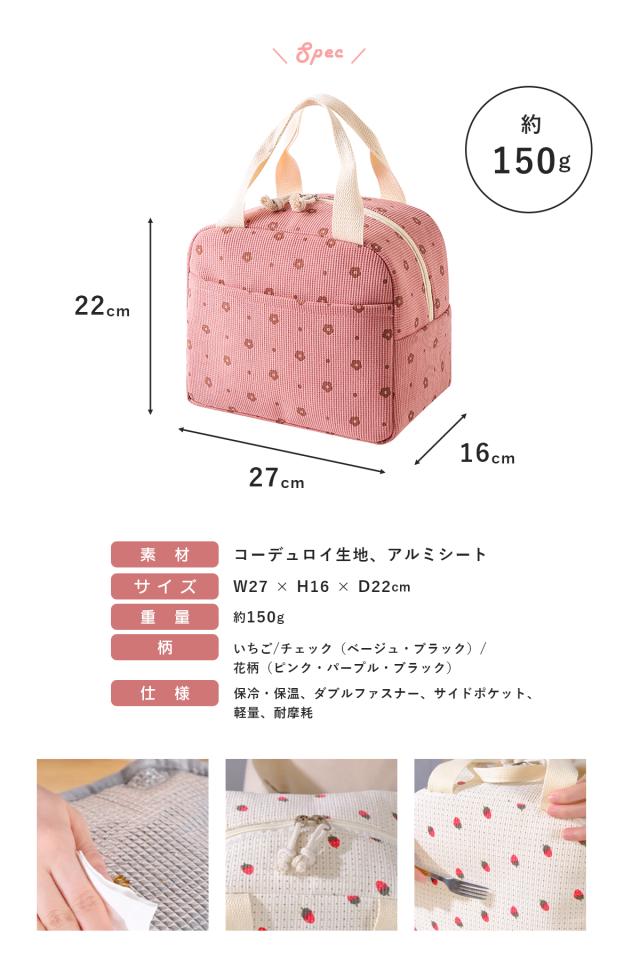 サイズ:約 幅27 × 奥行16 × 高さ22cm 重量:約150g 素材: 外側:コーデュロイ生地 内側:アルミ蒸着シート 仕様: ダブルファスナー 自立構造 外ポケット付き 対応容量目安: ・2段ランチボックス ・500〜600mlペットボトル ・保冷剤、デザート類 |
