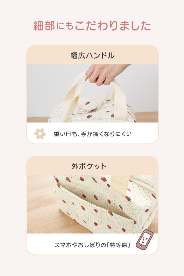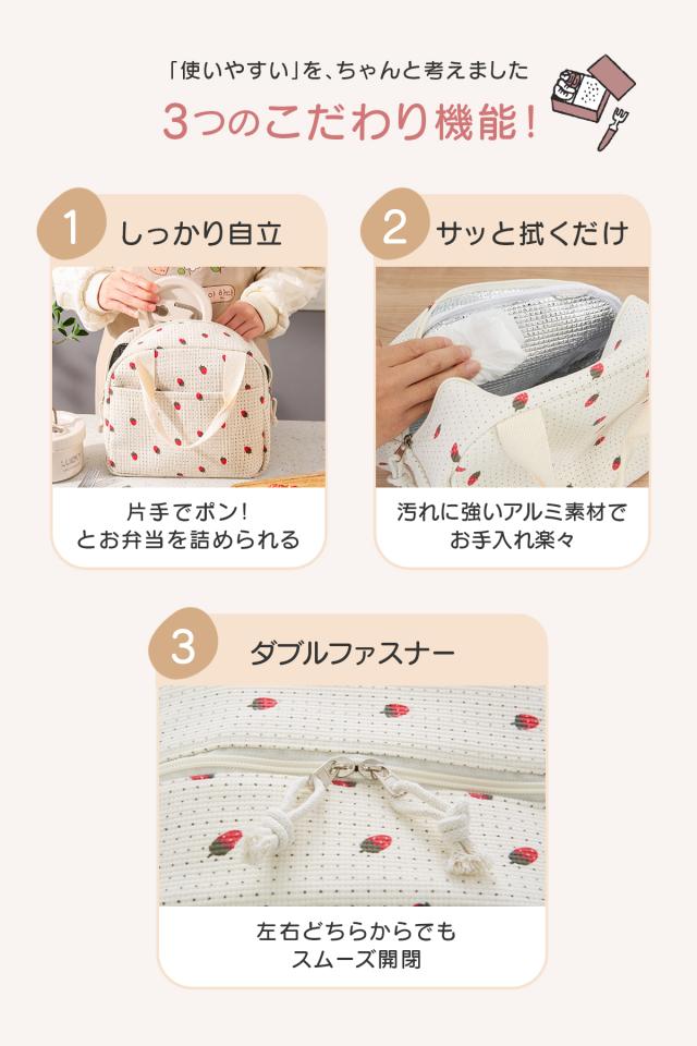 保冷・保温対応 アルミ蒸着シート採用で、夏も冬もランチの美味しさをキープ 見た目以上の大容量 2段ランチボックス+500〜600mlペットボトルがすっきり収納 自立設計で出し入れ簡単 コンビニ弁当も傾きにくく、平置きしやすい安定感 軽量約150g スマホ1台分ほどの軽さで、毎日の持ち運びも負担にならない 汚れに強くお手入れ簡単 内側アルミ素材で、汚れはサッと拭くだけ |