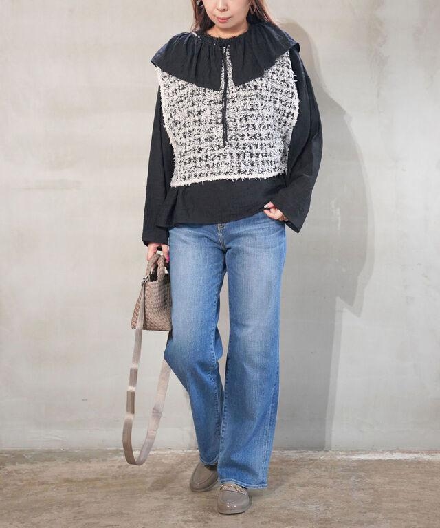 ボリューム感のあるブラウスにも重ねやすいのが嬉しいポイントに。