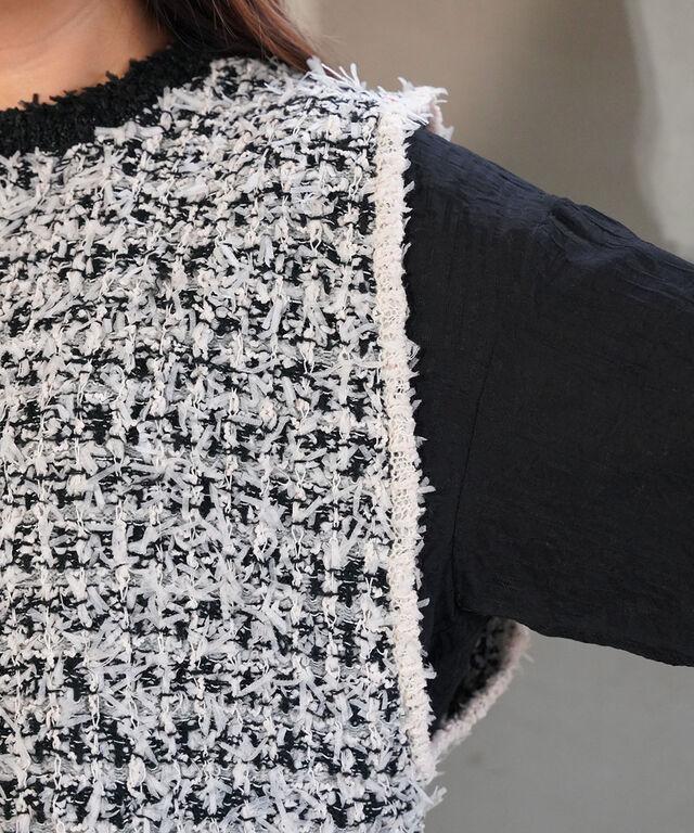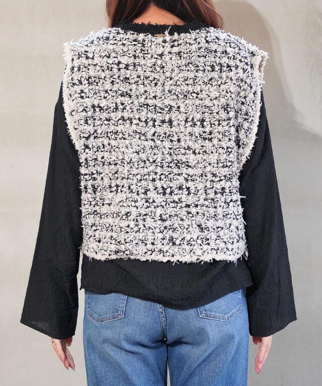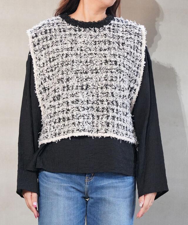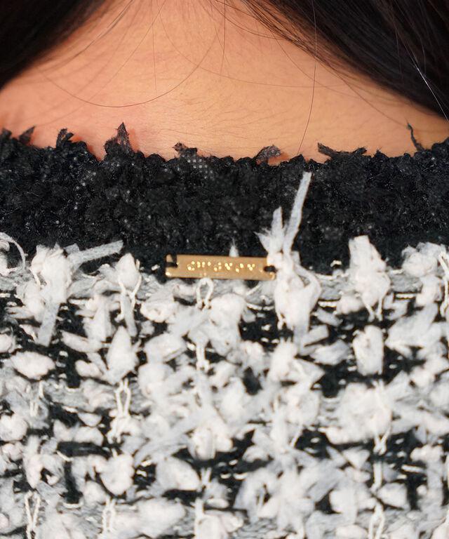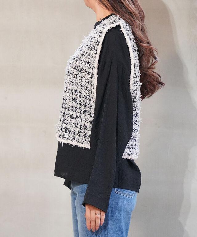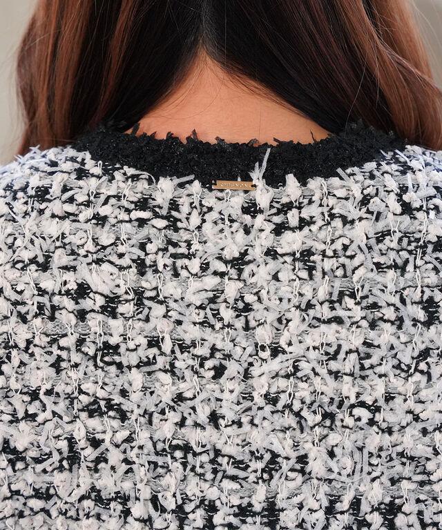 ツイードのようなルックスは、重ねるだけで一段と華やかな印象に!
