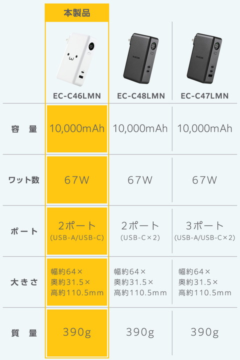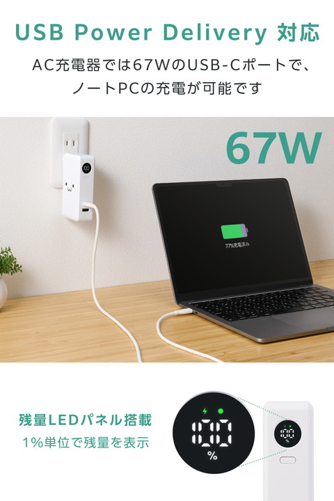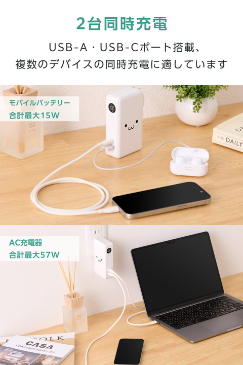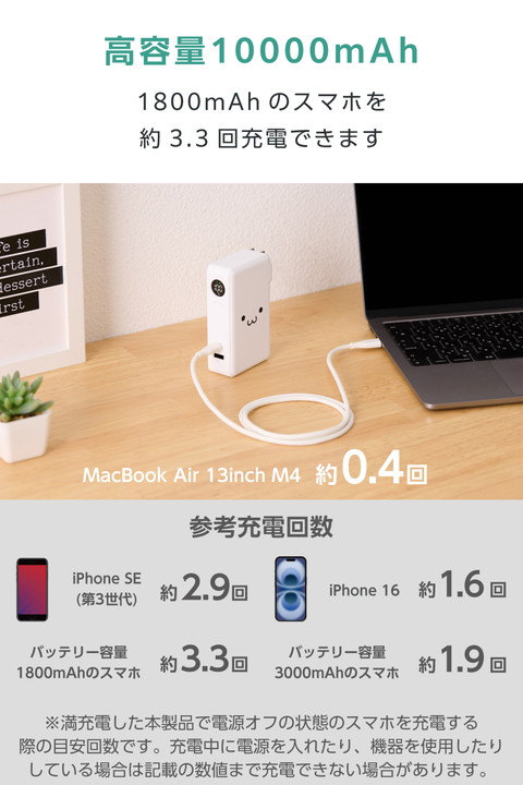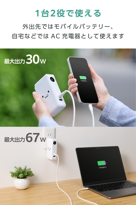 AC充電器としてもモバイルバッテリーとしても使用可能な2in1タイプ!ポーチやポケットにすっぽり収まる手のひらサイズ。2ポート搭載で複数のデバイスを一気に充電できる、AC充電器一体型モバイルバッテリーです。かわいいしろちゃんモデルです。![]() ■1台2役で使える、USB Power Delivery AC充電器一体型モバイルバッテリーです。 ■USB Type-C(TM)ポート×1、USB-Aポート×1を搭載。スマートフォンとワイヤレスイヤホンなど、複数のデバイスを接続して一気に充電できます。 ■モバイルバッテリーとAC充電器をそれぞれ持ち運ぶ必要がなくなり、出張や旅行時の荷物を減らせます。 ■モバイルバッテリー使用時最大出力30Wだから、スマートフォンを高速充電可能。外出先での急な充電切れの際も安心です。 ■本製品をコンセントに挿した状態でスマートフォンを接続することで、AC充電器としても使えます。 ■AC充電器として67Wの出力が可能。スマートフォンやタブレットはもちろん、MacBook Airなどのノートパソコンの充電にも使えます。 ■※67Wまでで充電可能なノートパソコンに限ります。 ■USB Power Delivery(PD)規格およびPPS規格に対応。接続機器に応じて電圧や電流を自動調整するため、iPhoneなどのスマートフォンやiPadなどのタブレットはもちろん、ノートパソコンまで幅広く充電できます。 ■※USB Power Deliveryとは、アダプターと接続機器間で情報をやり取りすることで、その機器間における最適な電力を選択し、高速充電を実現するUSB規格です。PPS(Programmable Power Supply)とは、0.02V単位で電圧を調整し、最適な電力で効率的に供給することができるUSB Power Deliveryのオプション規格です。 ■本製品とスマートフォンを同時に接続することでまとめて充電できる“まとめて充電”に対応しています。 ■※本製品はパススルー充電に対応しており、バッテリーを介さずに充電器から接続機器へ直接充電するため、電池の劣化を抑えられます。 ■コンセントに挿すだけで本製品を直接充電可能。本製品は約2時間50分で充電できます。 ■※本製品のみを充電した場合の目安時間です。 ■低電流モードにより、Bluetooth(R)ヘッドセット・イヤホンなどの小型電子機器を最適な電流で充電できます。 ※USB-Aポートのみ対応 ■接続機器を見分けて最適な充電を行う”おまかせ充電”に対応しています。 ※USB-Aポートのみ対応 ■電源プラグ部分にはスイングプラグ機構を採用。回転させて本体に収納できるためスマートに持ち運べます。 ■本製品(バッテリー容量10000mAh)で、1800mAhのスマートフォンを約3.3回、3000mAhのスマートフォンを約1.9回充電可能です。 ■※満充電した本製品で電源オフの状態のスマートフォンを充電する際の目安回数です。充電中に電源を入れたり、機器を使用したりしている場合は記載の数値まで充電できない場合があります。 ■Nintendo Switch(TM) 2/Nintendo Switch(TM)/Nintendo Switch Lite(TM)の充電が可能です。 ■※Nintendo Switchシリーズは動作モードによっては充電しながらのゲームプレイができない場合があります。また、Nintendo Switch2ではドック併用での使用には対応していません。 ■LEDパネルでバッテリー残量を1%単位で確認しながら使えます。 ■約500回繰り返し使用可能な充電式リチウムイオン電池を搭載しています。 ■内蔵の充電式リチウムイオン電池は、JIS C 62133-2:2020およびJIS C 8715-2:2024に準拠した安全設計です。 ■日本の電気用品安全法(PSE)の技術基準に適合した安全性の高い商品です。 ■過充電・過放電・過電流防止機能および短絡保護機能と温度検知機能の5つの保護機能を備えた安心の回路設計です。 ■Thermal Protectionを搭載し、通電時に温度を監視・制御することで、お使いの機器を守ります。 ■電池容量が160Wh(43,243mAh)以下であるため、機内持ち込みも可能です。 ■※航空会社の規定によって例外がある場合があります。 ■※工場出荷時に70%程度充電されています。充電式リチウムイオン電池は時間とともに放電するので、ご使用になる前に充電することを推奨します。 ■※ケーブルを挿したままにするとバッテリーの残量が減ってしまいます。使用しない場合は必ずケーブルを外してください。 ■※本製品とスマートフォンを接続するケーブルは付属していません。 ■※USB Type-C and USB-C are trademarks of USB Implementers Forum. ■本製品は、一般社団法人JBRCの回収対象製品であり、回収協力自治体や協力店(家電量販店・ホームセンターなど)で回収が可能です。 ■※JBRCのホームページでお住まいの地域の回収協力自治体・協力店をご確認ください。 ■筐体には再生プラスチックを採用しています。 ■管理された森林から生産された紙を使用し、環境負荷の低い、プラスチックレスパッケージを実現しています。 ■自社環境認定基準を1つ以上満たし、『THINK ECOLOGY』マークを表示した製品です。 ■環境保全に取り組み、製品本体の主たる構成部品や構成要素の原料に占めるリサイクル原料の割合が10%を超えている製品です。 ■環境保全