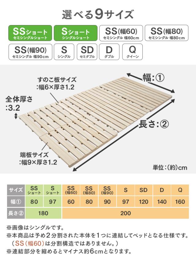 (約)幅97×奥行200×高さ3.2cm すのこ厚:1.2cm 桟木厚:2.0cm すのこ板幅:両端9cm 中間6cm すのこ間隔:両端ブロック1.9cm、中央ブロック1.3cm |