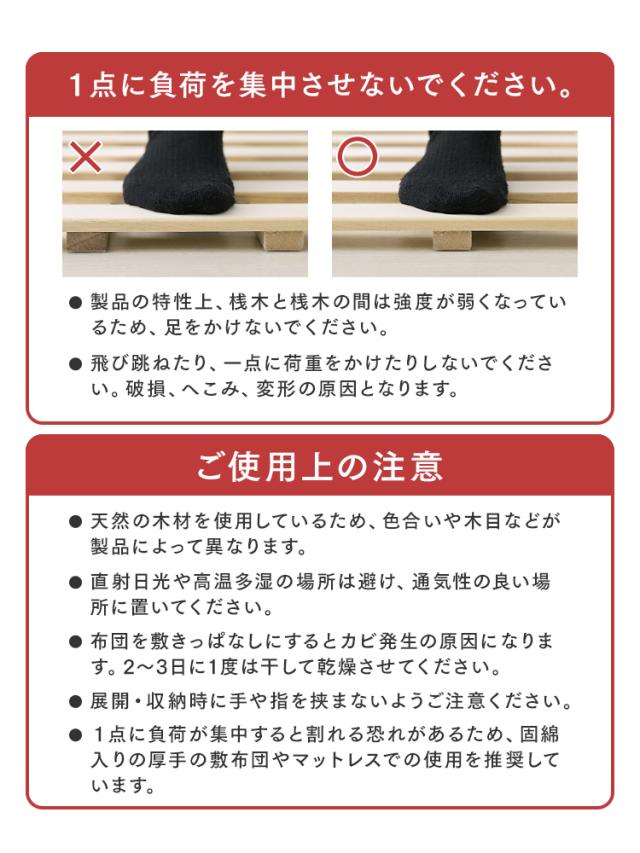・連結部分をまとめると−6cmになります。 ・すのこの上に立つ場合はさん木の上に足をかけるなど強度の弱い部分に体重がかからないようにご注意ください。 ・飛び跳ねたり、一点に荷重をかけたりすると割れる恐れがあります。 ・製造時期によっては若干色味が異なる場合があります。 ・商品は、モニターによって色合いが異なって見える場合があります。 ・仕様・デザインは改良のため予告なく変更することがあります。 |