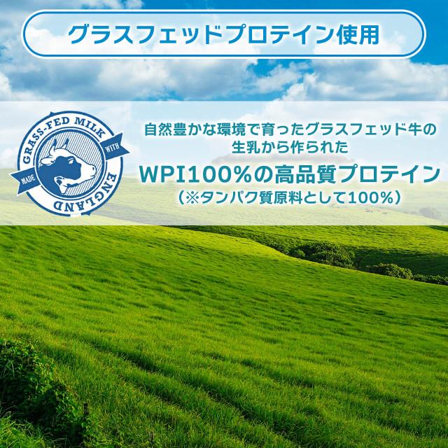 自然豊かな環境で育ったグラスフェッド牛の生乳から作られたWPI100%のホエイプロテイン(※タンパク質原料として100%)。