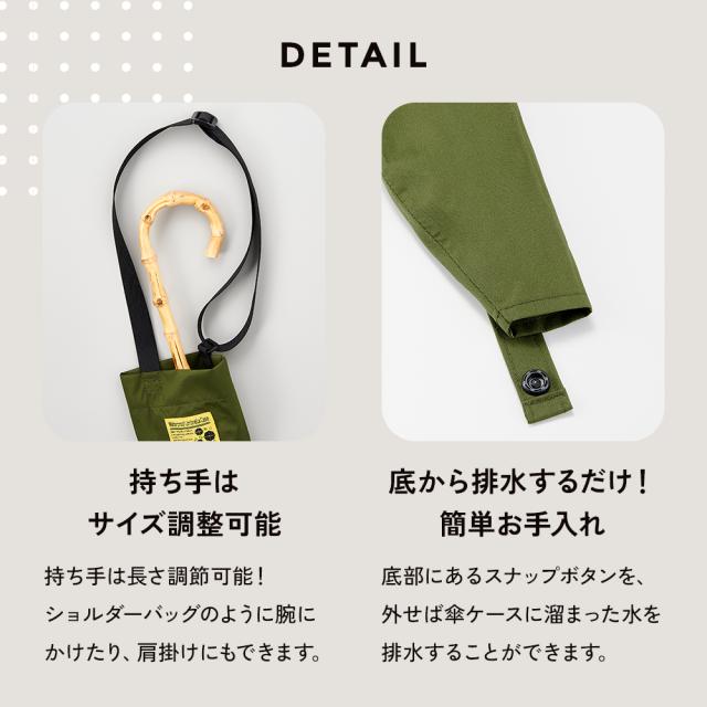 表面ははっ水加工、内側は防水テープ仕様で、電車や車に乗る時に床や服を濡らさないから水漏れ対策として使える傘ケース。