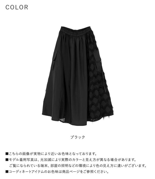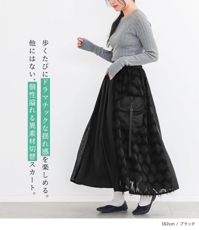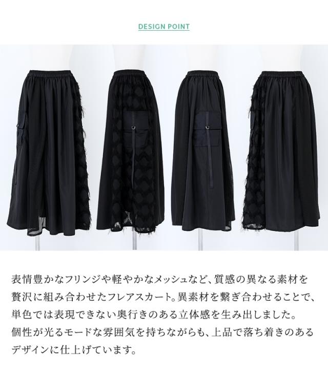<冬新作>『パターン切替スカート』【メール便不可】【20】[ロングスカート レディース ボトムス フレアスカート ロング丈 マキシ丈 異素材 フリンジ メッシュ 春 秋 冬 オシャレウォーカー]