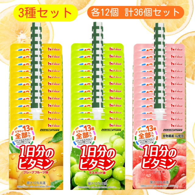 ハウス 1日分のビタミン 3種セット 最短賞味期限2026.9 各12個 計36個セット グレープフルーツ味 マスカット味 ピーチ味 180g ビタミン ゼリー飲料 詰め合わせ アソート 業務用 ゼリー パウチ 1日分のビタミンゼリー まとめ買い セット 常温