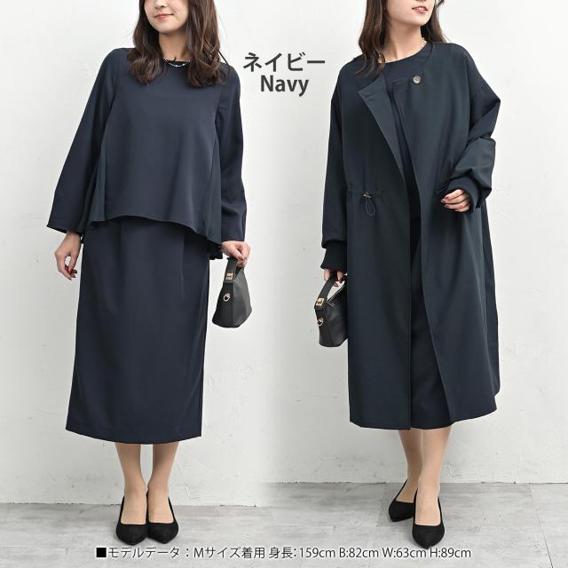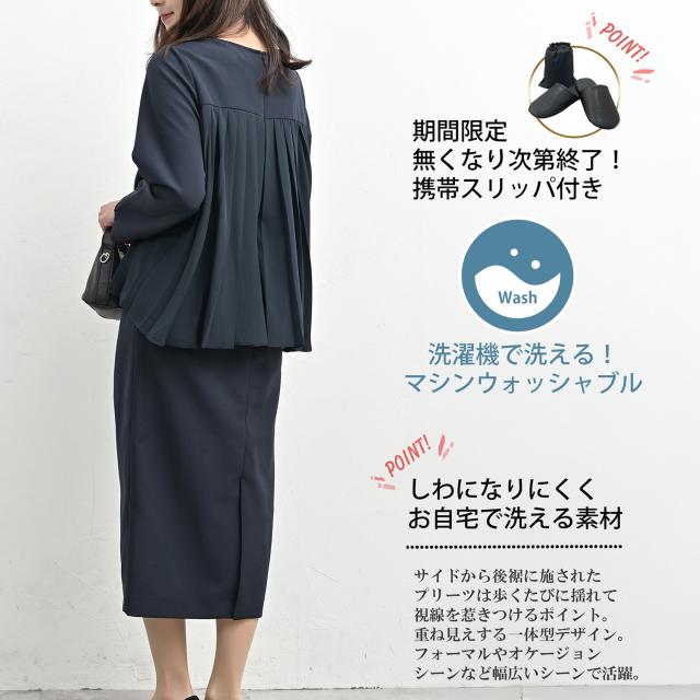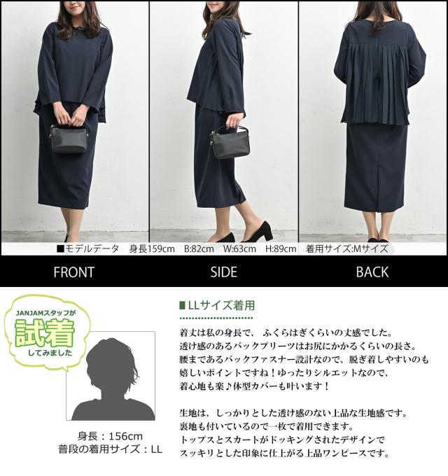 動くたびに表情が出る 上品バックプリーツワンピース。 ストレスフリーなシルエットで ナチュラルに体型カバーが叶う セットアップ風デザイン。 きれい見えとラクさを両立できる フォーマルウェアです。 |