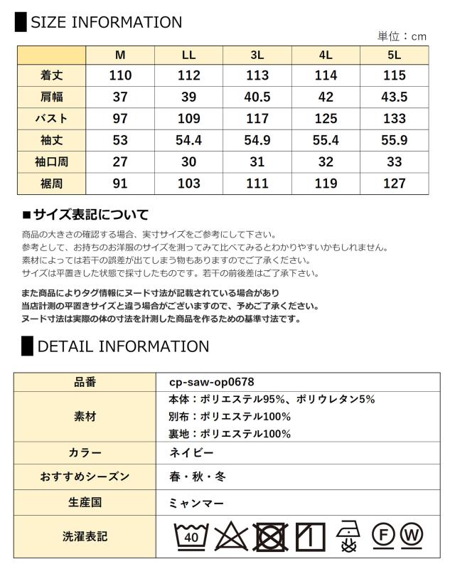 3L:着丈113 肩幅40.5 バスト117 袖丈54.9 袖口周31 裾周111