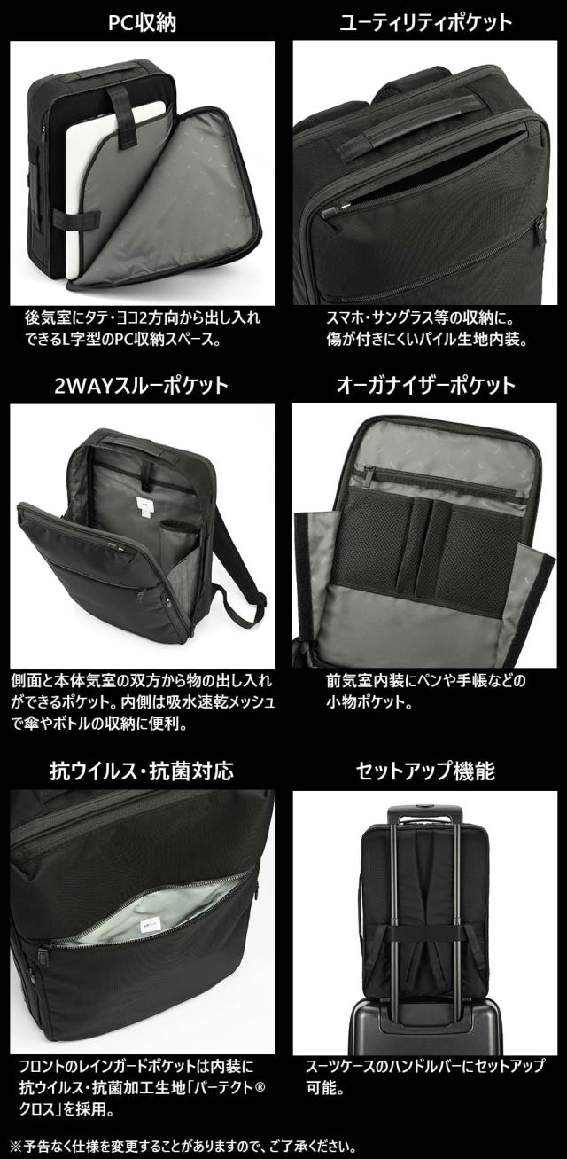 機能一覧:2気室/B4ファイル収納/PC収納(15.6inch)/セットアップ可/2WAYスルーポケット