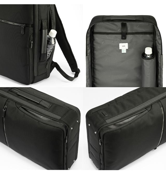 リュック背面へはスーツケースのハンドルに固定可能なセットアップベルトを設置。 出張などでも便利にお使いいただけます。