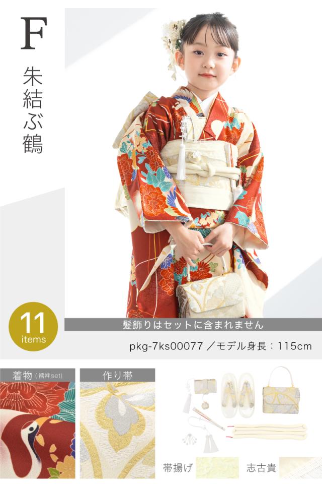 セット内容は【着物・襦袢・作り帯・はこせこ(びら簪付)・まるぐけ・帯揚げ・しごき・扇子・草履・バッグ】の豪華な11点です。