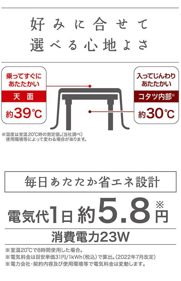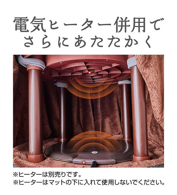 ヒーター本体:ABS樹脂脚:ポリプロピレン・ABS樹脂こたつ布団:ポリエステルマット:表地/ポリエステル、底面/ポリエステル・塩化ビニル樹脂