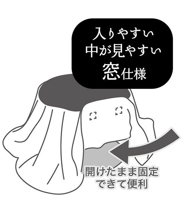 こたつ布団に脱着簡単な面ファスナーの窓を設けているので中に入りやすく、中の様子確認がしやすい。