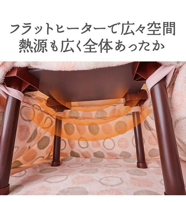 フラットヒーターなので、こたつの中は広々と使え、ヒーター熱源部も広いので全体的にあたたかくなる。
