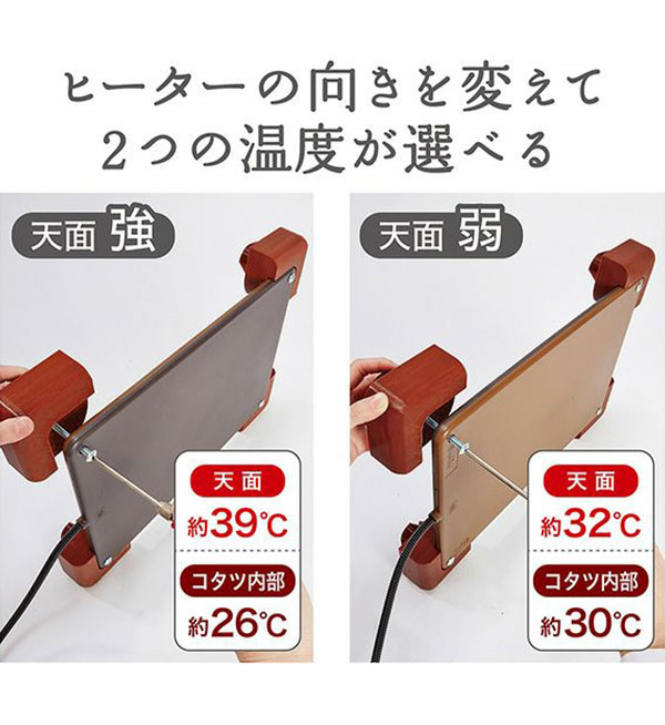 ヒーターの表裏をひっくり返す事で2つの温度が選べる。(天面強の場合:天面約39℃/コタツ内部約26℃)(天面弱の場合:天面約32℃/コタツ内部約30℃)