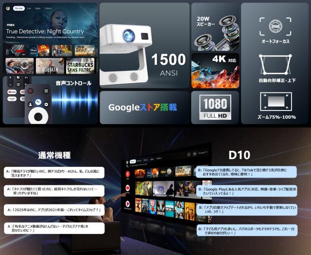 D10家庭用プロジェクターがついに登場!プロジェクターに最新のGoogle TVを搭載し、アプリ数は従来比で約5倍に。ネトフリやアマプラなどの定番動画アプリはもちろん、音楽・ライブ中継・ゲーム・料理などの生活系アプリも多数対応。あらゆるエンタメを1台で楽しめます。数だけじゃない、国内で使用率が高く本当に使えるアプリが勢揃い。さらに、D10家庭用プロジェクターには