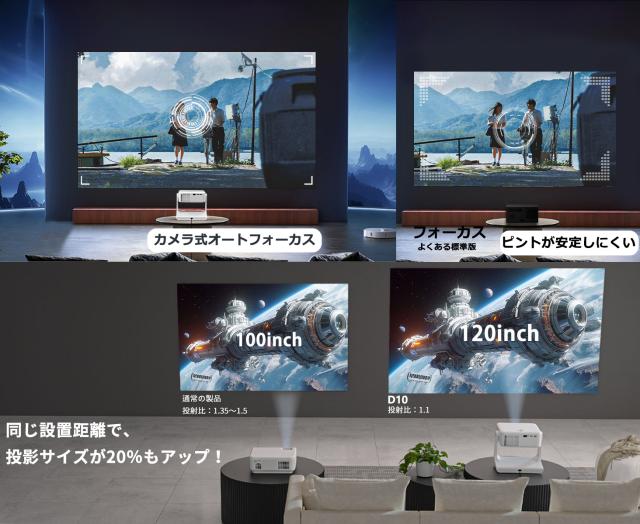 ピント調整の精度と安定性が向上し、動画再生中でも短時間で素早く自動調整。お客様の声をもとに改良され、初めての方でも安心して快適に使える、扱いやすい操作性を実現しました。さらに、D10は業界初のAI駆動の±45°自動補正機能を搭載(※4点台形補正搭載で左右方向の調整も可能)。AIが自動で環境を分析し、投影壁の材質をリアルタイムで計算して、完璧な長方形の映像を自動で提供します。狭い部屋でも、暗い壁でも、常に鮮明で美しい映像が保たれる!面倒な設定は一切不要で、すぐに使い始められるのが魅力です。さらに、50%〜100%ズームや4:3、16:9アスペクト比にも対応し、設置スペースに合わせて柔軟に調整でき、最大300インチの超大画面を楽しめるのです!