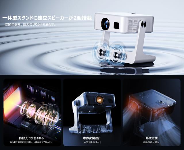 プロジェクタースタンド底部には独立したHIFIスピーカーを2つ配置。これにより、スピーカーとファンの距離を広げ、機器の振動やノイズを大幅に軽減。映画やゲームの臨場感が格段に向上し、立体感のある音質であなたを包み込みます。家庭用プロジェクターならではの夜間使用を考慮し、複数の日本の一般的な居室サイズを調査したうえで、より快適な重低音バランスに調整。音が過度に響かず、周囲を圧迫せず、クリアで心地よいサウンドを実現。映画や音楽の細かな音も鮮明に再現され、静かな夜の環境にぴったりです。さらに、Bluetooth 5.4搭載で互換性による音質問題を軽減!※HDMI接続時は本体Bluetooth非対応のため、スピーカー利用には出力機器側のBluetooth対応が必要です。