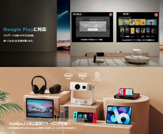 高速2.4G/5G対応のWi-Fi6で、スマホやタブレットの写真・動画をD10プロジェクターの大画面にワイヤレスで簡単に共有可能。スマホとの無線接続もスムーズで、ストレスなく映像を楽しめます。 従来機種の多くはAndroid・iOSのみ対応で、GoogleスマホはChromecastを別途購入する必要がありましたが、D10プロジェクターは公式認証型番のため、Googleスマホと直接ミラーリングが可能です。ストリーミングアプリの動画やライブ配信はもちろん、スマホ画面そのままも大迫力で映し出せます。