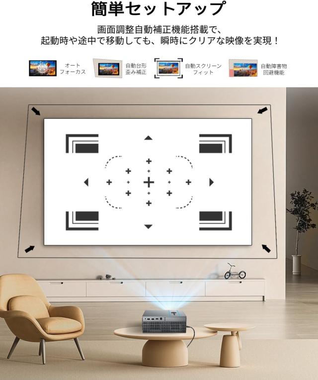【AI技術・ 自動フォーカス ・自動台形補正・100%-40%ズーム】スマートプロジェクターX6ATVには最先端のAI技術を搭載しており、「オートフォーカス」「自動台形補正」「自動スクリーン調整」「自動障害物回避」ではの利便性も大きな魅力です。AI技術が内部に組み込まれており、使用するたびに環境に合わせた最適化が行われます。どんな部屋の形状や、スクリーンの位置に関わらず、AIプロジェクターが自動的に調整し、常に最高の視覚体験を提供します。映画のシーンが目の前で生き生きと再現され、まるで映画館にいるかのような没入感を味わうことができます。さらに、ズーム機能により、距離に制限されることなく映画を鑑賞でき、適切な視聴サイズに調整できます。