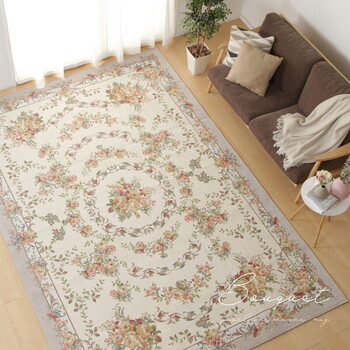 たくさんの花束モチーフが空間を上品に彩る、ゴブラン織りシェニールラグ。