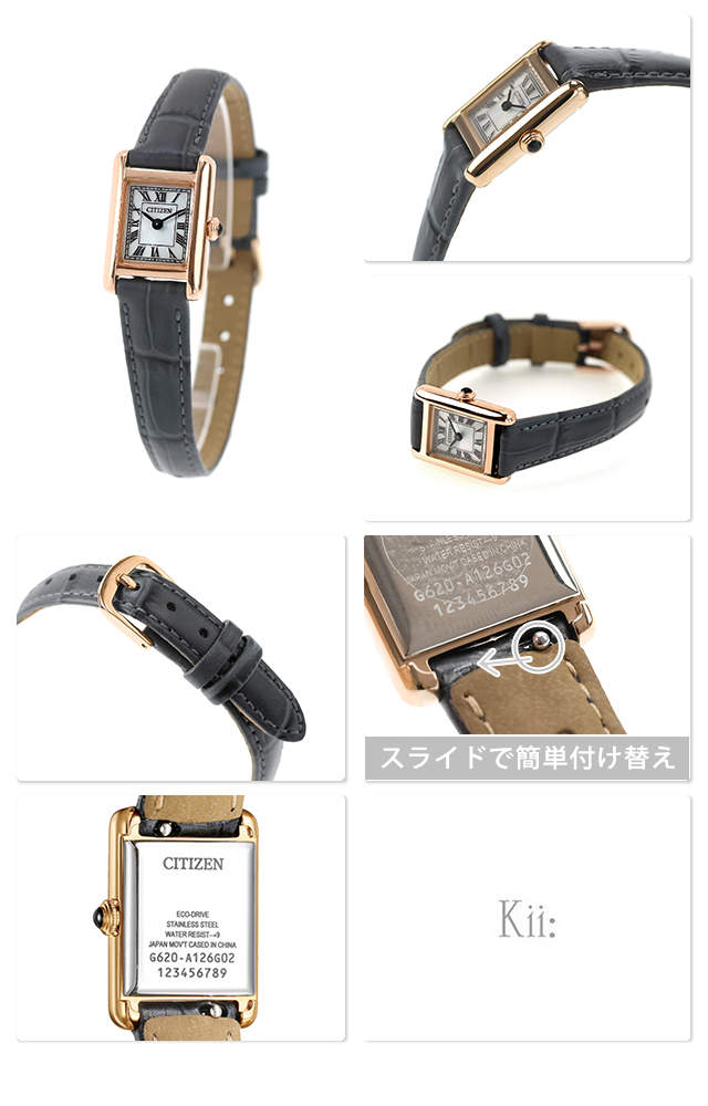 2月12日発売予定 予約受付中 正規品 7年保証キャンペーン 送料無料 シチズン キー ソーラー エコ・ドライブ レディース 腕時計 EG2799-18W CITIZEN Kii Classic Square アナログ シルバー グレー ◆アンティークデザインのエコ・ドライブアクセサリーウオッチシチズン Kii:(キー)。時代を超えて愛される、クラシカルな表情のスクエアケースモデルが復活。ヴィンテージ調の雰囲気を漂わせながらも、優しさと落ち着きを感じる、新しいデザインにアップデートしました。2012年に誕生し、ロングセラーだったスクエアモデルが、新しいデザインで復活しました。極小のエコ・ドライブムーブメントを搭載。サイドに丸みを持たせたケースが、洗練された優しさを醸し出します。ローマ数字で統一したインデックスと型押しを施した牛革バンドが、落ち着きのあるクラシカルな表情を際立たせています。少し大きめのりゅうずが小ぶりなケースにアクセントを添えています。 発売日:2026年2月発売